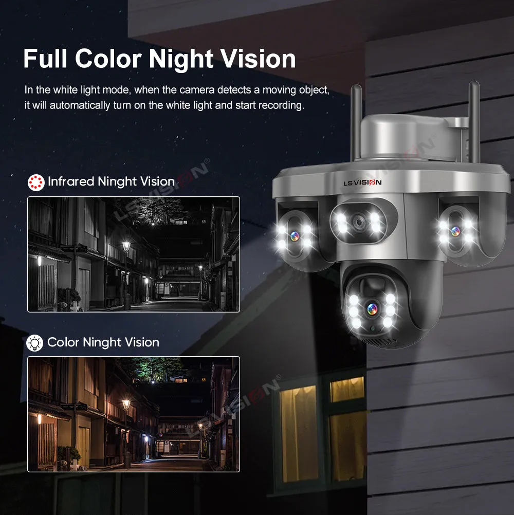 distance: within 8 meters 9. Arbitrary arming time can be set and alarm sound can be set 10. 4mm +4mm+4mm lens,10X digital zoom,built-in infrared light + white light, IR distance 20 meters 11.Support humanoid automatic tracking