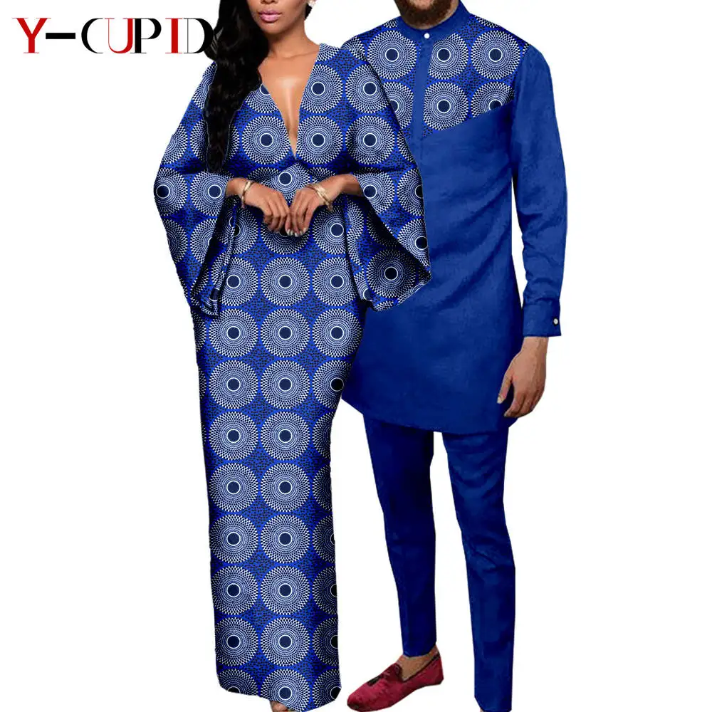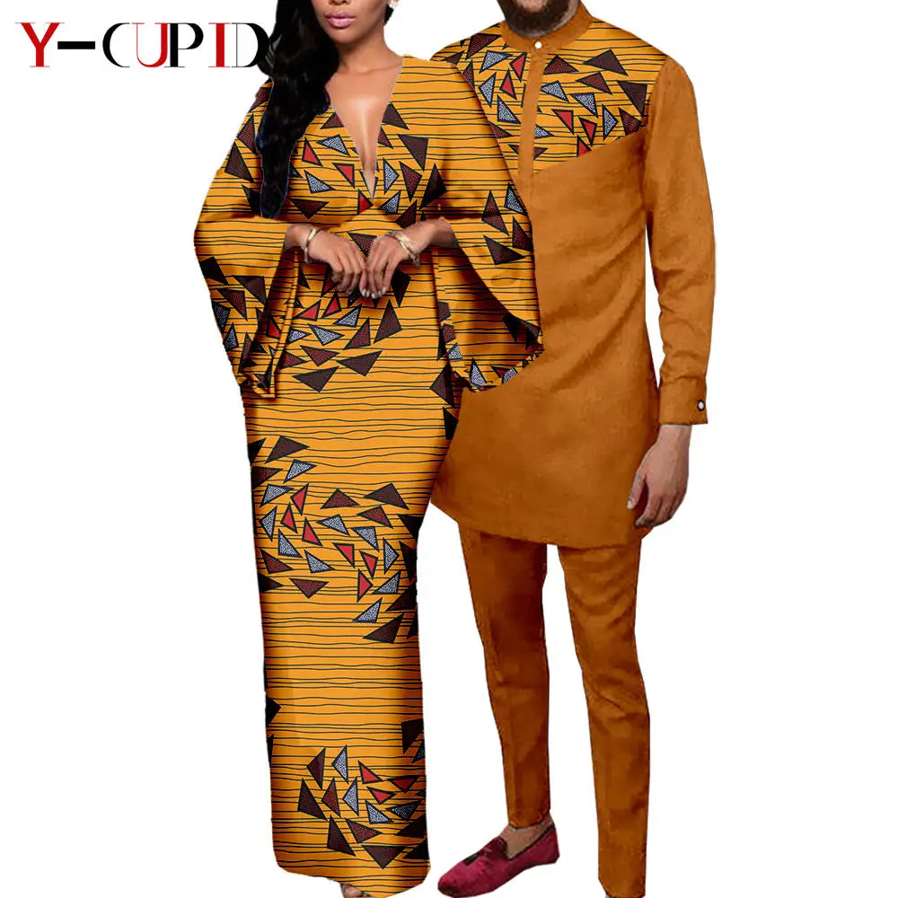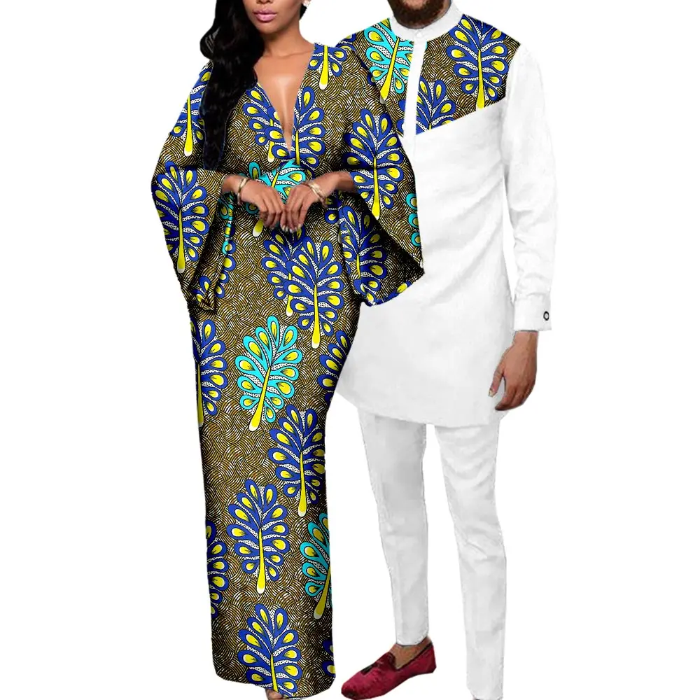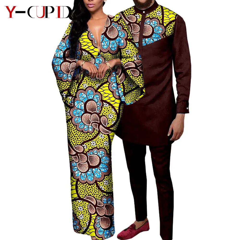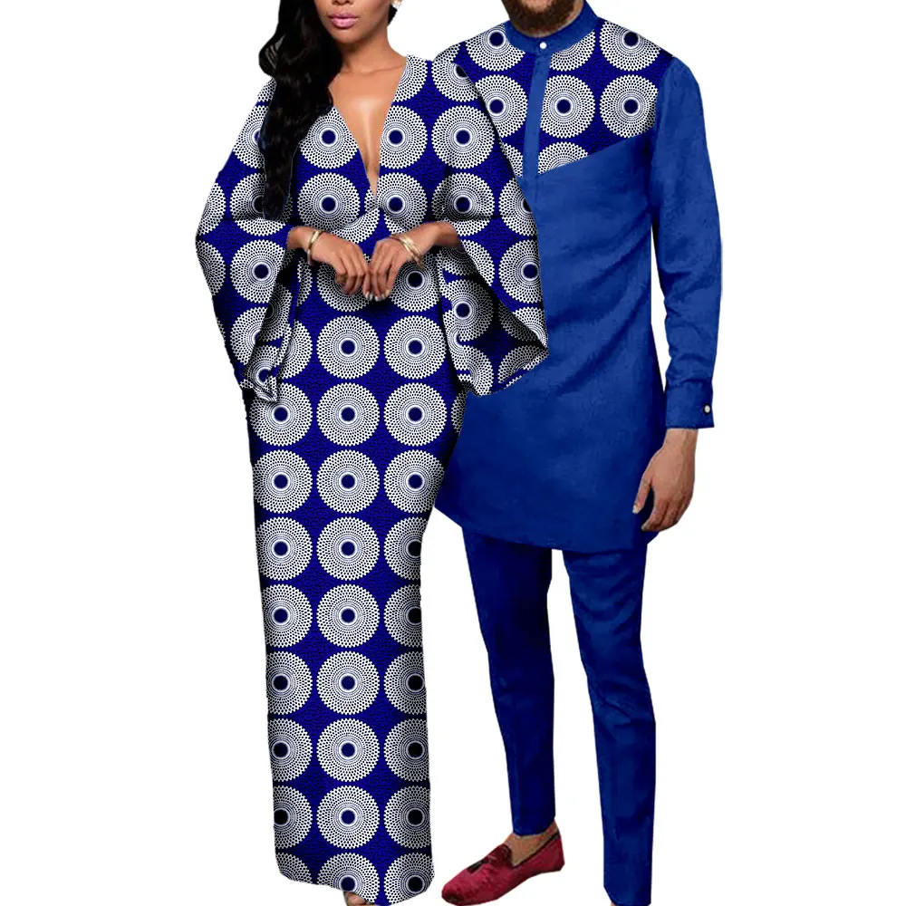 Couple Clothes African Print Deep V neck Long Dresses for Women Matching Men Outfits Dashiki Top Shirt and Pant Sets Y23C088
