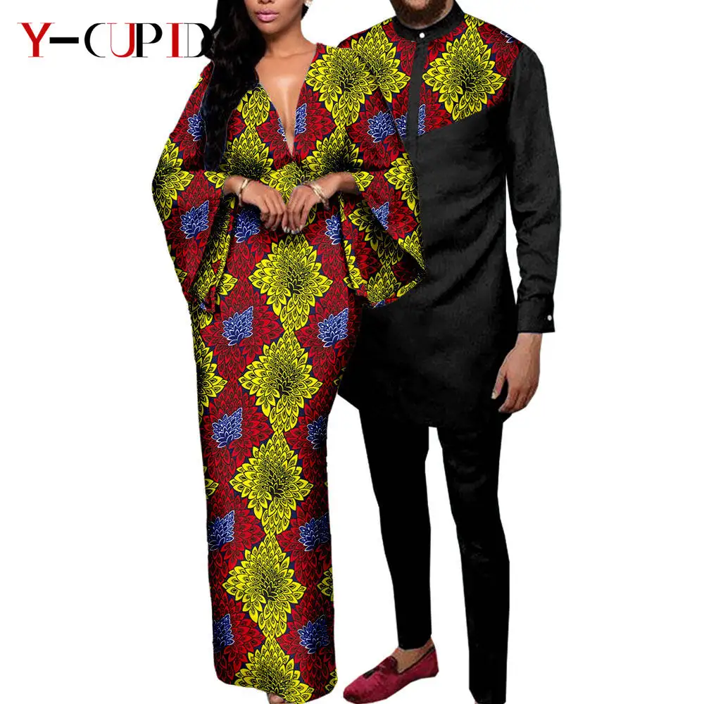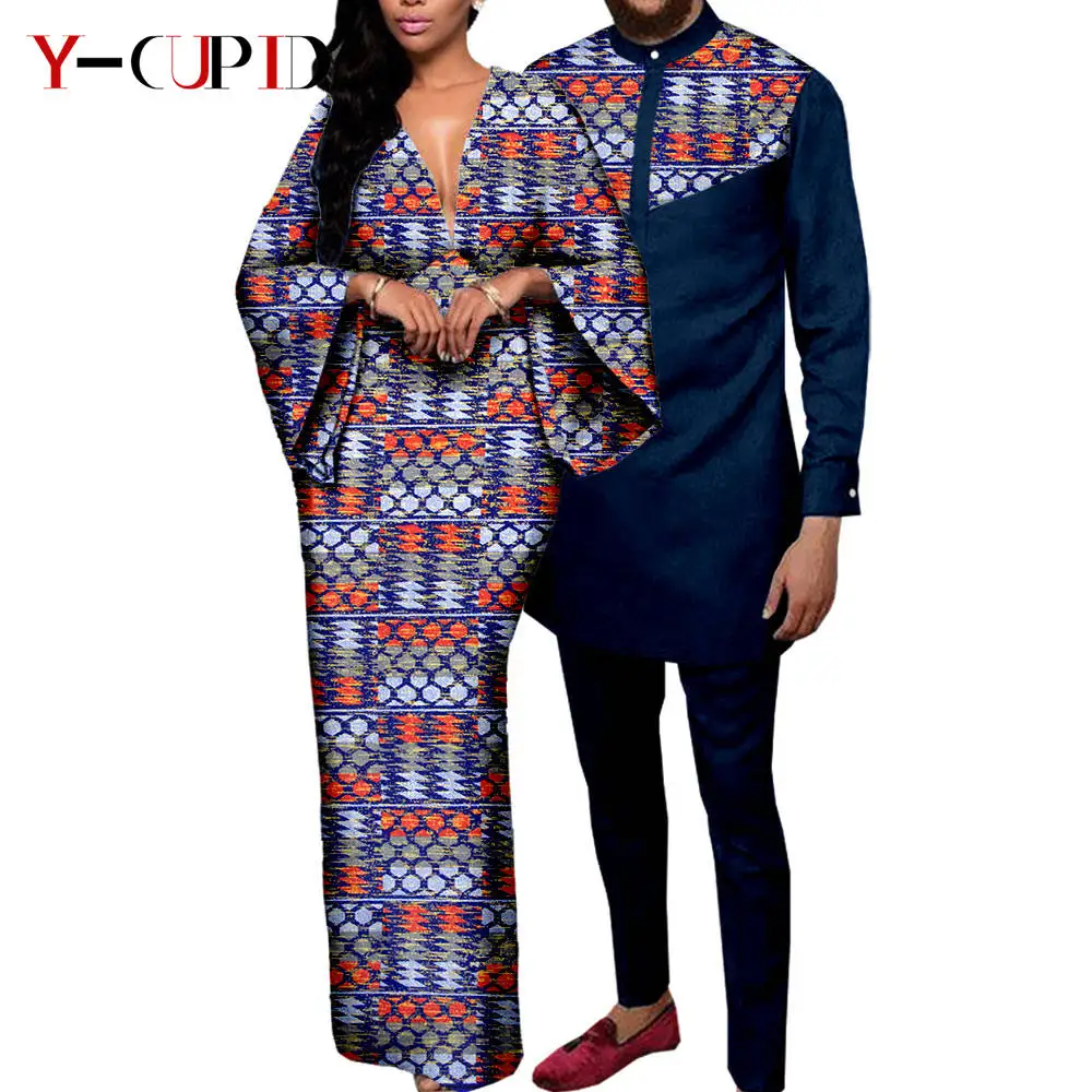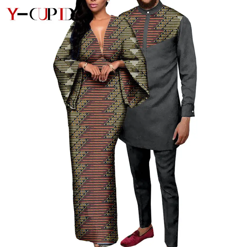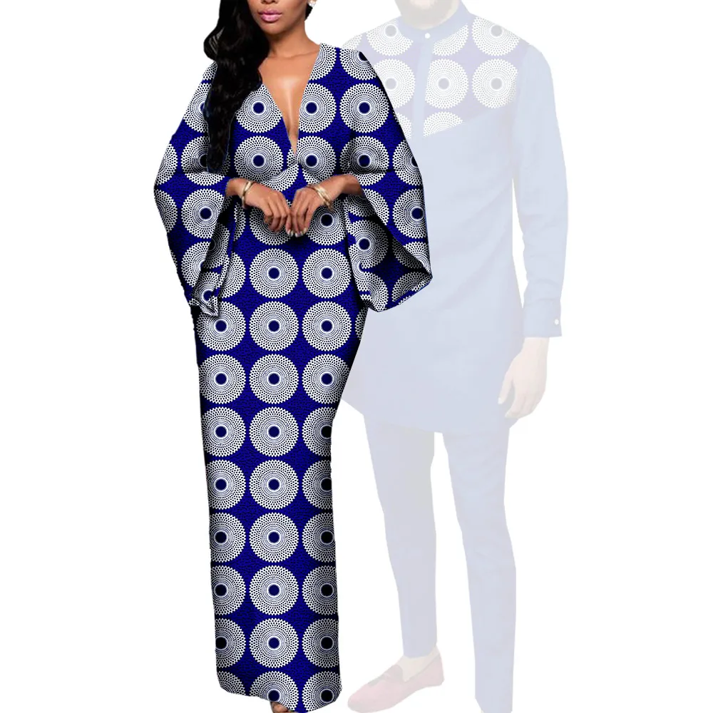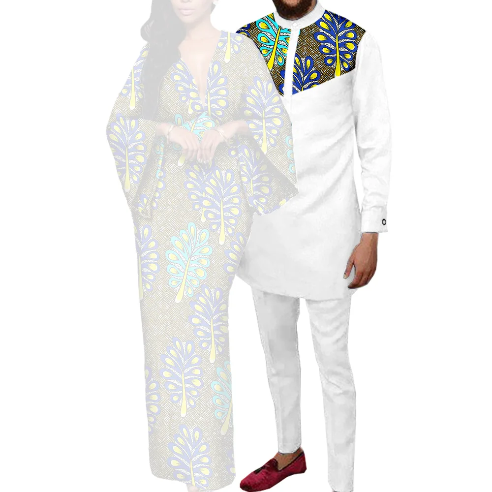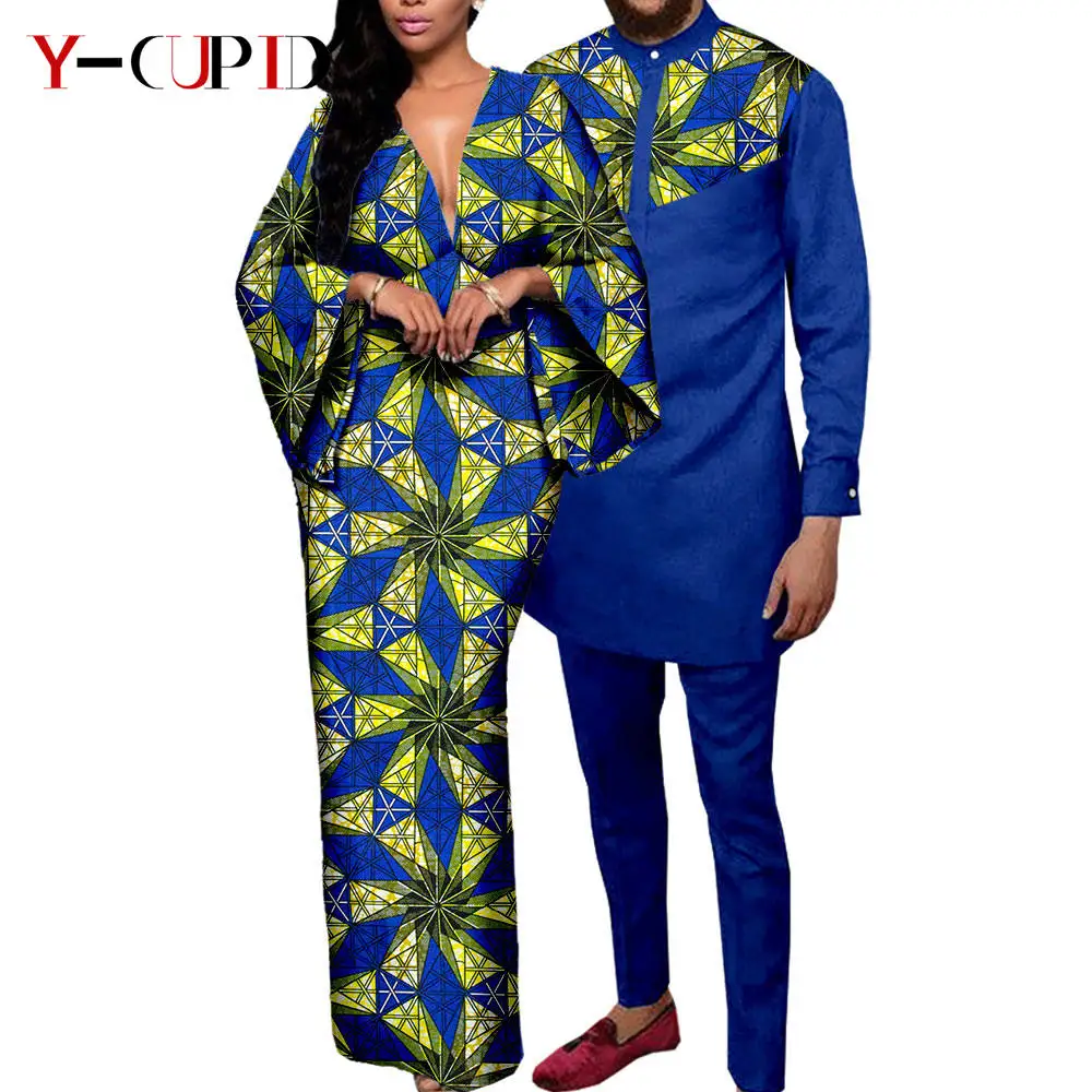Couple Clothes African Print Deep V neck Long Dresses for Women Matching Men Outfits Dashiki Top Shirt and Pant Sets Y23C088
