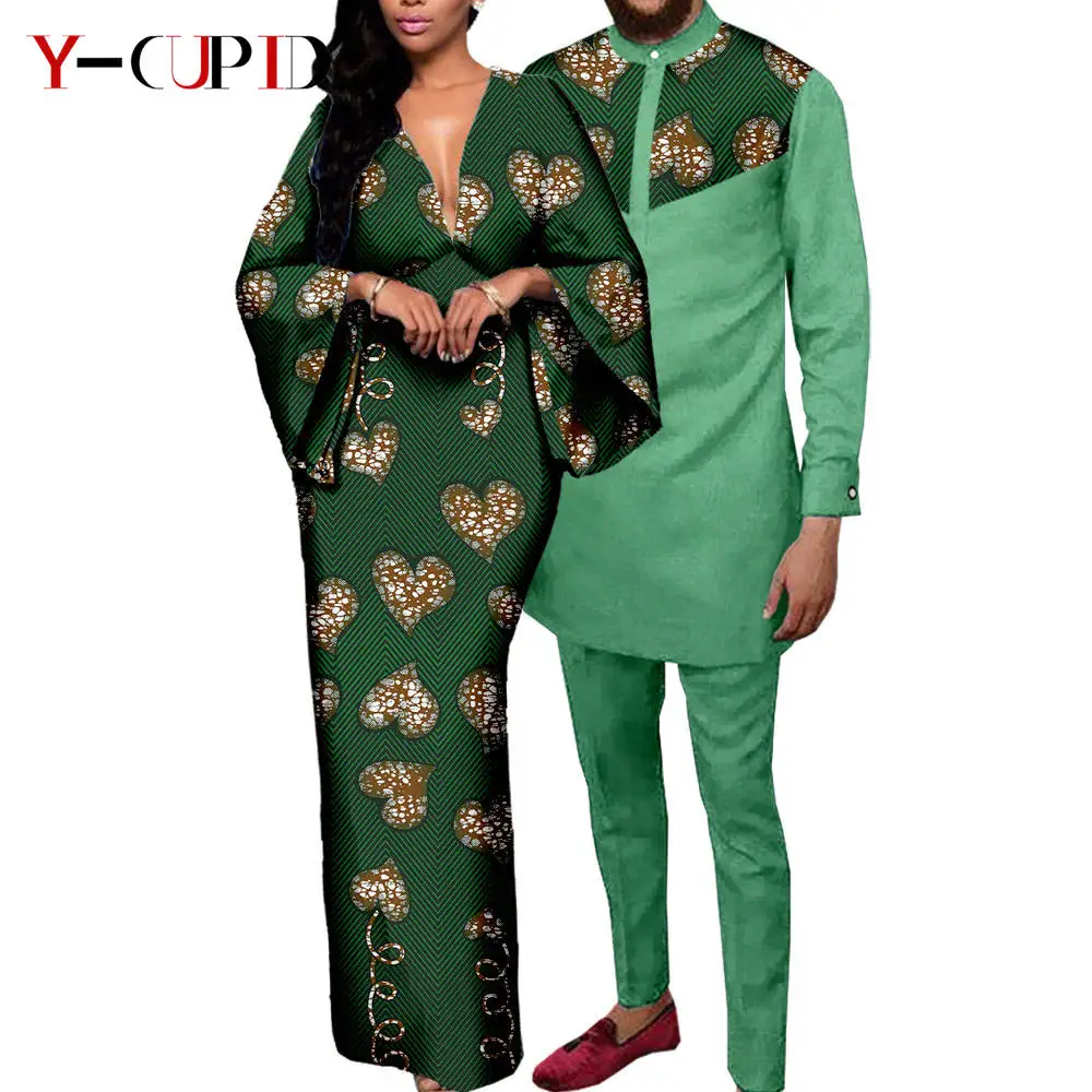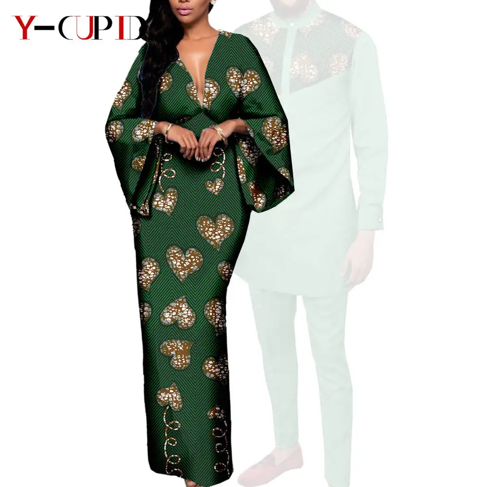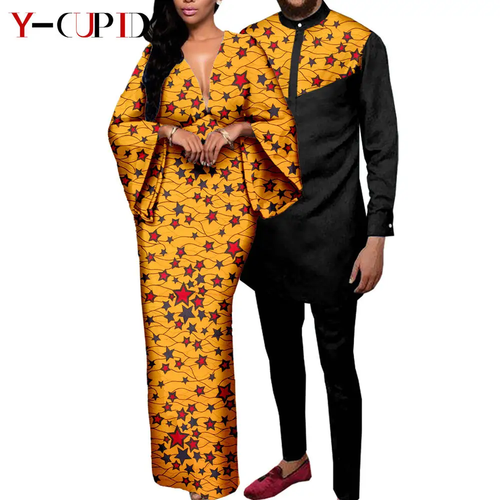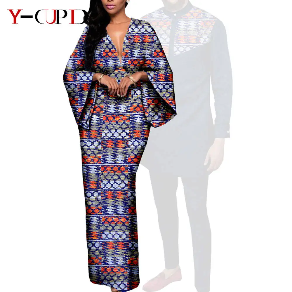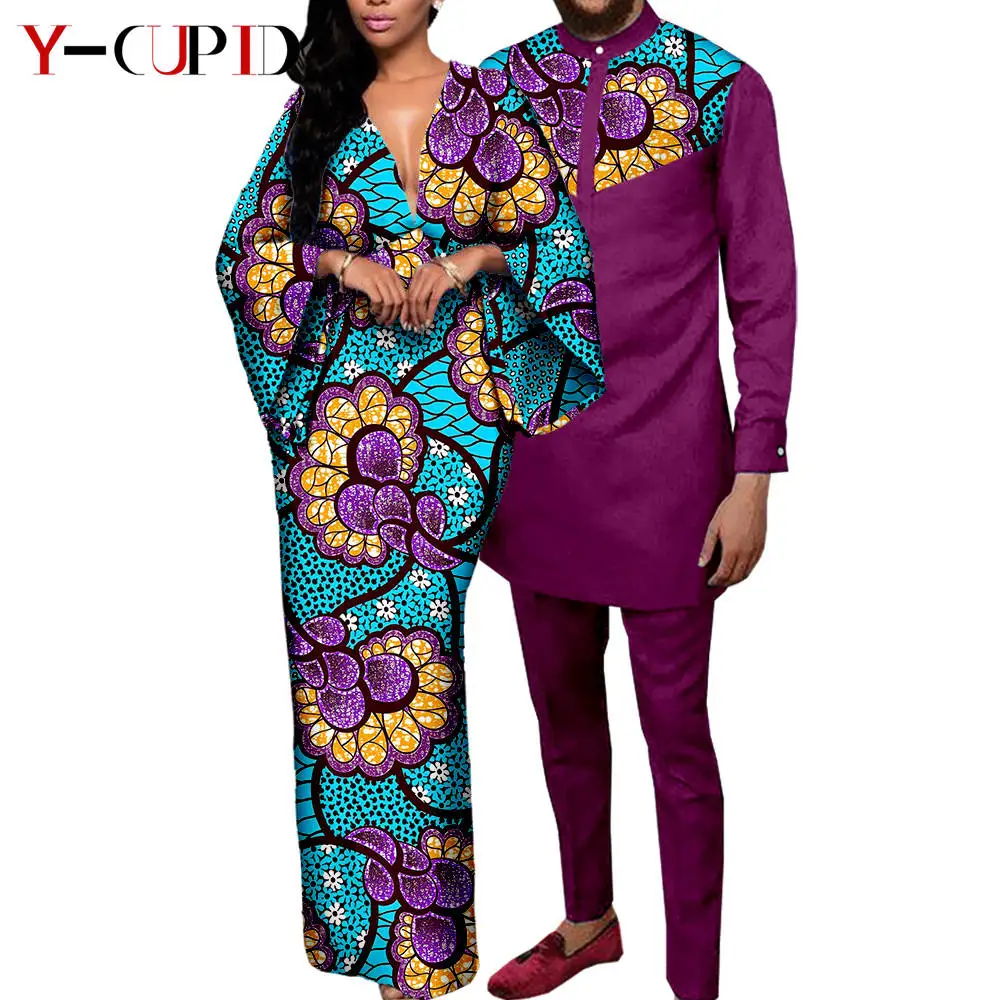 Couple Clothes African Print Deep V neck Long Dresses for Women Matching Men Outfits Dashiki Top Shirt and Pant Sets Y23C088